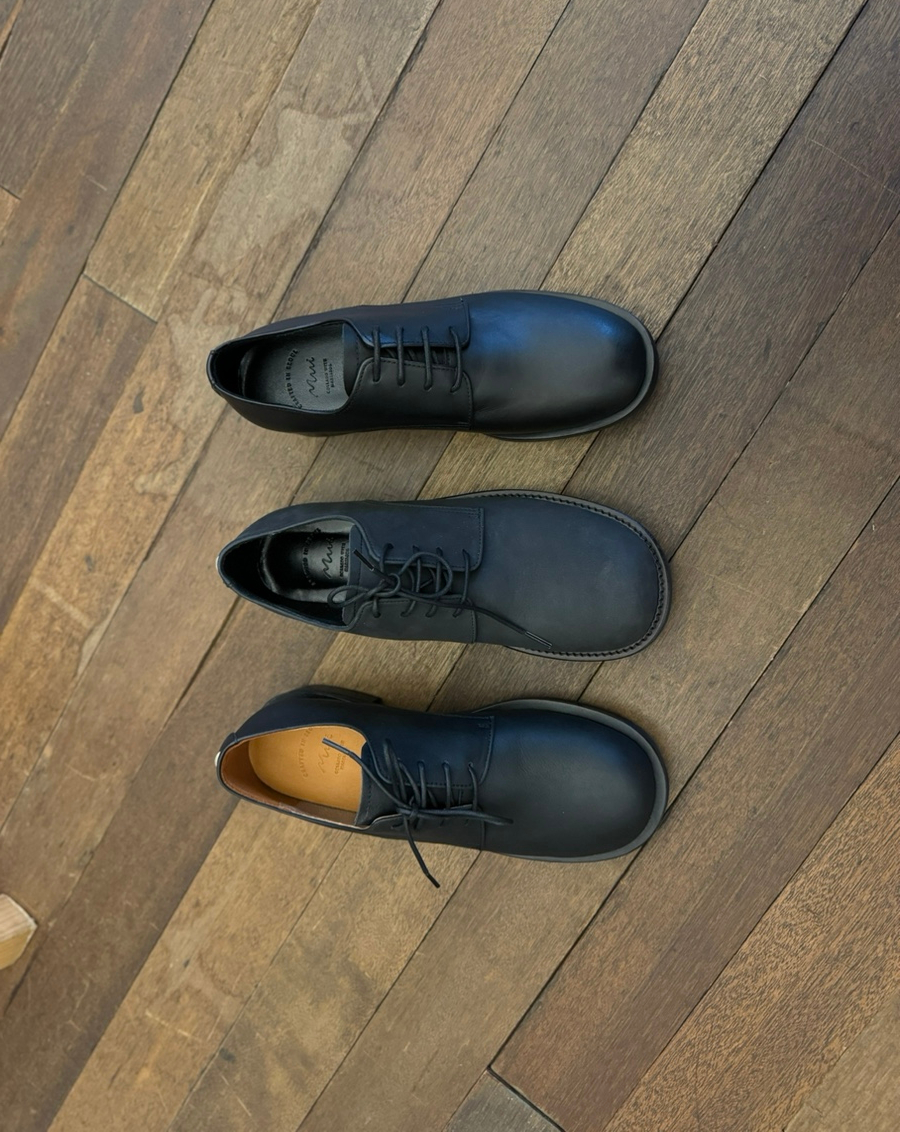 안녕하세요. 무이 운영자 입니다. 두 번째 더비 슈즈를 만들었습니다. 제가 처음 더비 슈즈를 산 건 빈티지 가게였어요. 20대 때였는데, 그때나 지금이나 저는 좀 ‘생활감 있는 멋’을 좋아하는 편이라 반짝반짝하고 트랜디한 신발엔 손이 잘 안 가더라고요. 그 신발은 이태리에서 만들어진 거였는데, 앞코가 뾰족하지도 너무 두툼하지도 않고 적당해서 딱 좋았어요. 사실 물건을 만드는 입장에서 적당하다던가 편하다는 말이 얼마나 광범위하고 구현하기 어려운 말인지 실감하지만, 정말 그랬어요. 가죽은 이미 길이 들어 있었고, 굽을 갈아가며 5년 넘게 신었었죠. 그래서인가 ‘더비는 오래 신을수록 더 멋있다’는 인상이 남게 된 것 같아요. 반짝이는 신사보다는 푸근한 인상으로. 두 번째 헤이더비는 이런 마음에서 시작하게 됐습니다. - Granfa's Shoes! 사실 이번엔 ‘할아버지’들의 사진이 영감이 되었어요. 즐겨보는 인스타 계정 @gramparents에서 보면, 편안한 면바지를 입고 미소를 짓거나 뭔가에 몰두해 있는 어르신들 사진이 종종 올라와요. 인생을 길게 살아오며 긴장감이 조금씩 내려앉은 모습들. 그런 편안하고 자연스러운 분위기를 담은 신발을 만들어보고 싶었어요. 처음 신을 때부터 부담 없이, 긴장감 없이, 자유분방한 마음을 일으키는! 신발의 얼굴, ‘앞코’ 이번 디자인에서 제일 고민이 많았던 건 앞코 모양이었어요. 앞코는 신발 디자인 지분의 절반 이상을 차지할 만큼 중요하지요.. 헤이더비 오리지널보다는 여유 있고 부드러운 라인을 줄 것인가, 아니면 각을 살려 또렷한 인상을 줄 것인가.. 직접 신어보고 스타일링해 본 결과, 각이 있는 디자인이 캐릭터가 더 분명하게 드러났고, 가죽의 질감과도 잘 어울렸습니다. (좌) 최종 디자인 (우) 중간 샘플 : 둥근 코 라인 차이가 보이시나요? 가죽도 고민 되었는데요. 무난한 무광의 블랙 가죽을 할지, 조금 독특한 인상의 기모 가공이 들어간 밝은 블랙으로 할지. 최종으론 역시 할부지 자연스러움의 기준으로 밝은 블랙 가죽을 택했습니다. 블랙이지만 부드럽고 따뜻한 질감을 주고, 시간이 깃들수록 멋스러워질 가죽이거든요. 아래 사진을 보면 가죽 질감과 신발 라인의 차이가 보이실 거예요. (맨 위) 헤이더비 오리지널 (가운데) 헤이더비 빈티지 (맨 아래) 중간 샘플 : 둥근 코, 무광 가죽 라스트 디자인을 보면 빈티지 버전은 앞코 공간이 넉넉해서 발가락 움직임이 편합니다. 내부 공간을 여유 있게 설계했지요. (맨 위) 헤이더비 오리지널 (가운데) 헤이더비 빈티지 (맨 아래) 중간 샘플 : 둥근 코, 무광 가죽 - 더비 슈즈는 끈이 발등을 잡아줘서 활동성이 좋아요. 그래서 저는 ‘많이 걸을 일이 있는데 운동화는 좀 그렇다’ 싶은 날 자주 신어요. 편하면서도 신경 쓴 느낌을 준달까요. 제가 무이 슈즈 중 가장 자주 신는 디자인이기도 합니다. 한 달 이상 신으면서 착화 테스트를 해봤어요. 비 오는 날에도 신어보면서 가죽의 변화를 관찰했습니다. 롤링 되는 부분에 주름이 잡히기 시작하고요. 바랑 블랙처럼 빈티지한 사용감이 생기기 시작해요. 보는 사람마다 처음보다 멋있어진다는 피드백을 주었습니다. (사진 속 중간 샘플에 있던 세피 스티치는 최종 디자인에선 뺐습니다.) 모단한 착장엔 모단하고요. 바랜 듯 독특한 색감과 질감 때문에 동양적인 디자인의 리넨 원피스와도 잘 어울리고, 단정한 블랙룩에도 잘 어울립니다. 트렌치코트나 가을 아우터에는 뭐 당연히. 스포티하게도 스타일링 해봤는데, 이땐 신발이 너무 새 거였어서 생활감이 생기면 더더더 멋스럽겠다 했어요. 저는 그냥 처음 영감받았던 할부지들처럼 편한 스웨터와 청바지/면바지에 자주 신을 것 같습니다. 호. 이번에도 뒷꿈치엔 핸드 스티치로 마무리 : ) 무이 슈즈는 매월 1 ~6일에 주문을 받아 개별 제작하는 수제화입니다. 헤이더비 빈티지 구매하기