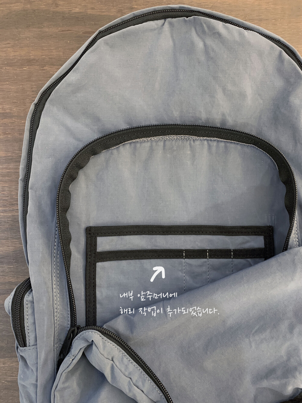 앞 포켓에는 작은 소품들을 수납할 수 있도록 내부 포켓을 추가로 넣었습니다.