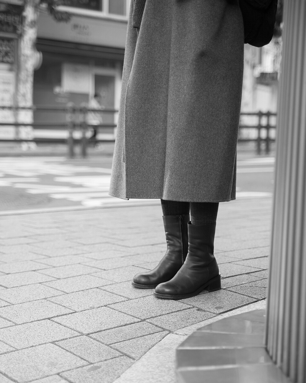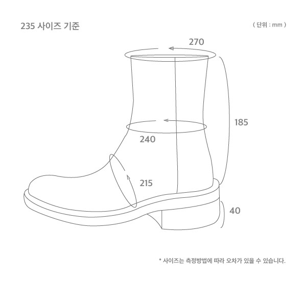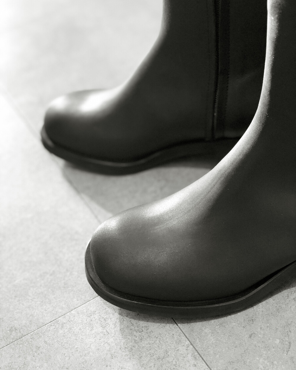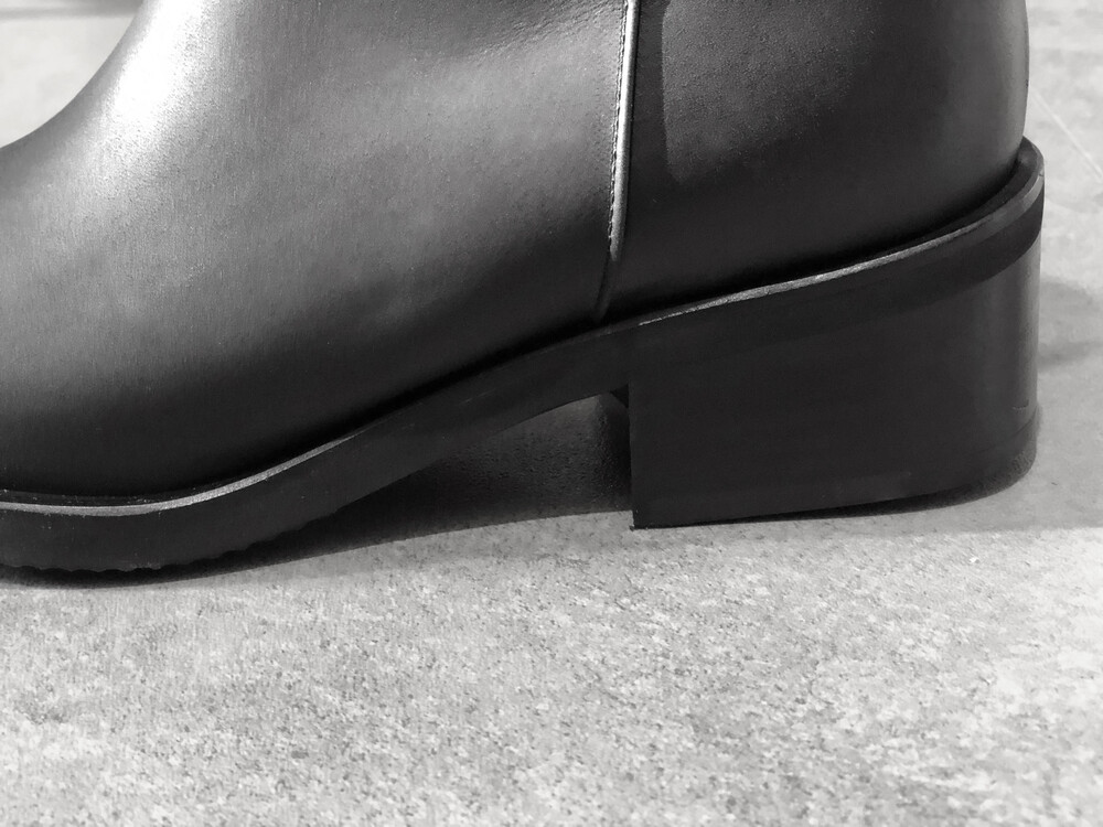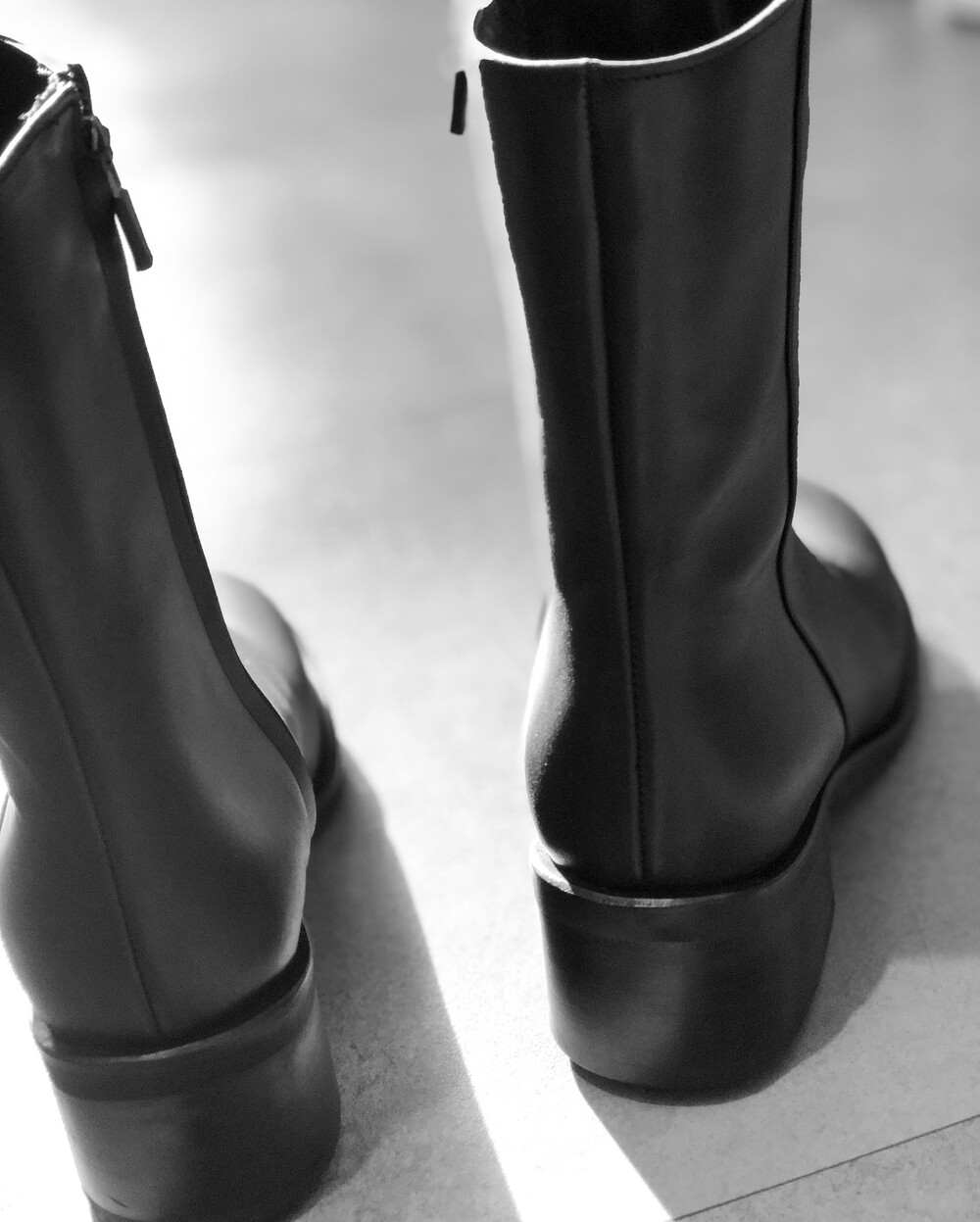 통이 넓은 부츠는 다리를 짧아 보이게 하고, 스타일링이 쉽지 않아요. 스판 부츠는 트렌디한 분위기 때문에 부담스럽고요. 이런 점들을 고려하며 종아리에서 발목으로 내려가는 선을 살려 너무 붙지 않으면서도 예쁜 선을 살릴 수 있게 디자인 했습니다. 처음엔 가죽이 하드한 편이라 걸음이 어색하고 불편할 수 있지만, 점차 주름이 잡히면서 편해집니다.