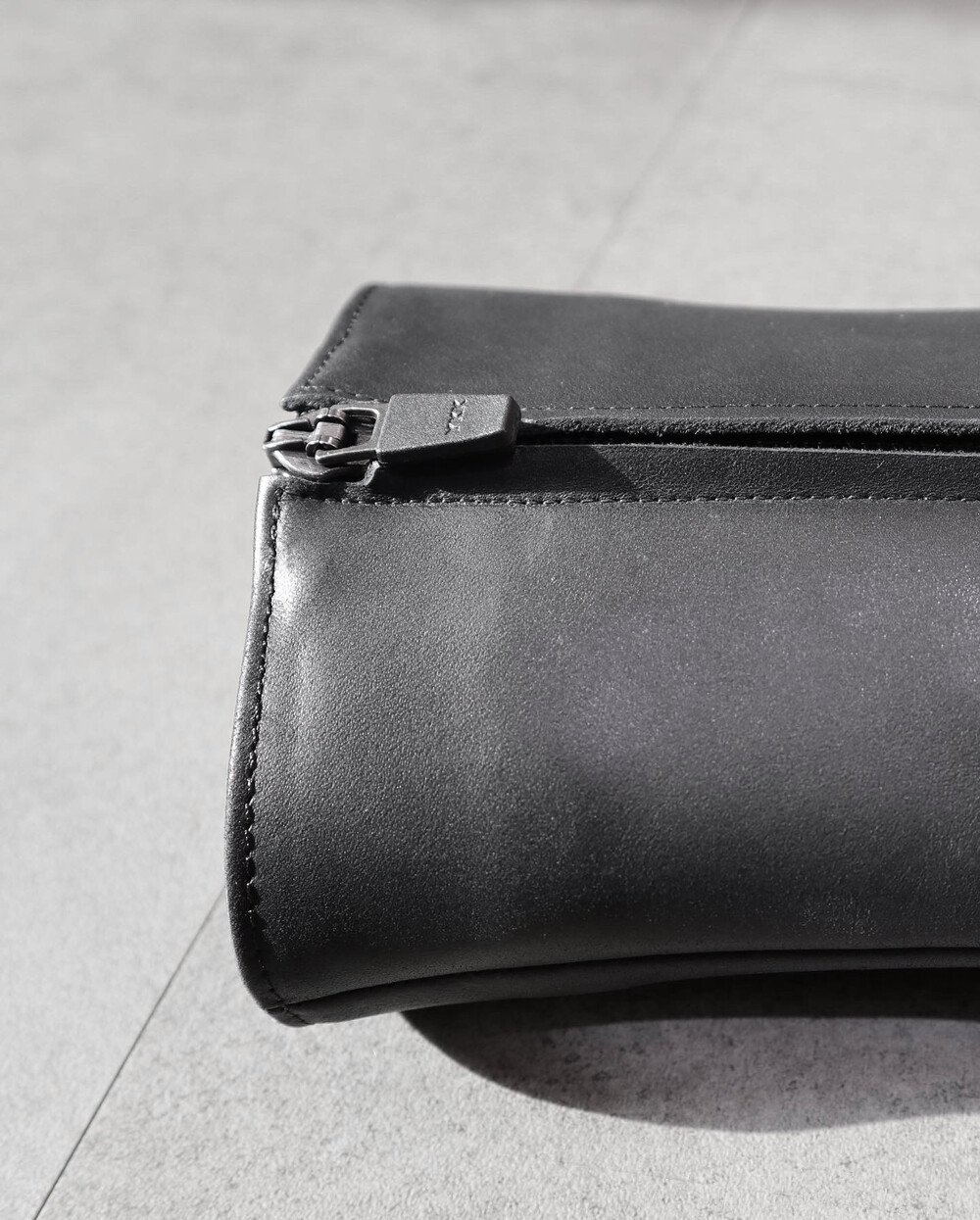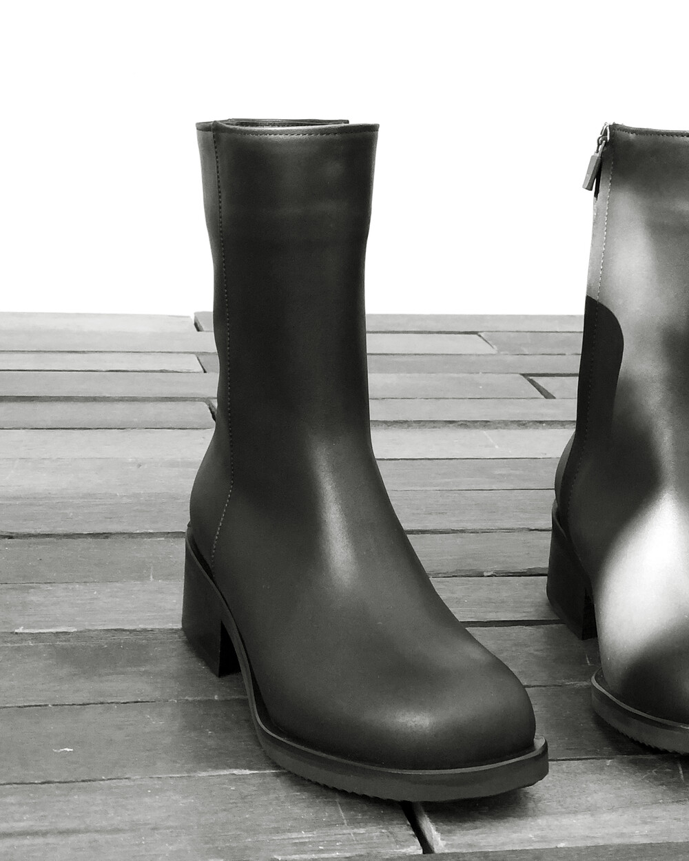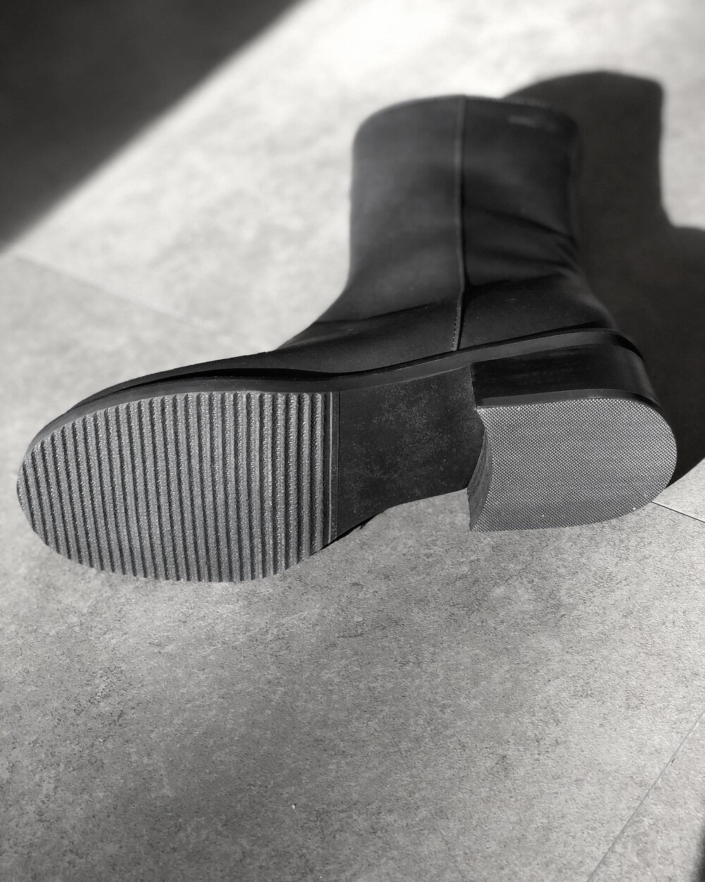 통이 넓은 부츠는 다리를 짧아 보이게 하고, 스타일링이 쉽지 않아요. 스판 부츠는 트렌디한 분위기 때문에 부담스럽고요. 이런 점들을 고려하며 종아리에서 발목으로 내려가는 선을 살려 너무 붙지 않으면서도 예쁜 선을 살릴 수 있게 디자인 했습니다. 처음엔 가죽이 하드한 편이라 걸음이 어색하고 불편할 수 있지만, 점차 주름이 잡히면서 편해집니다.