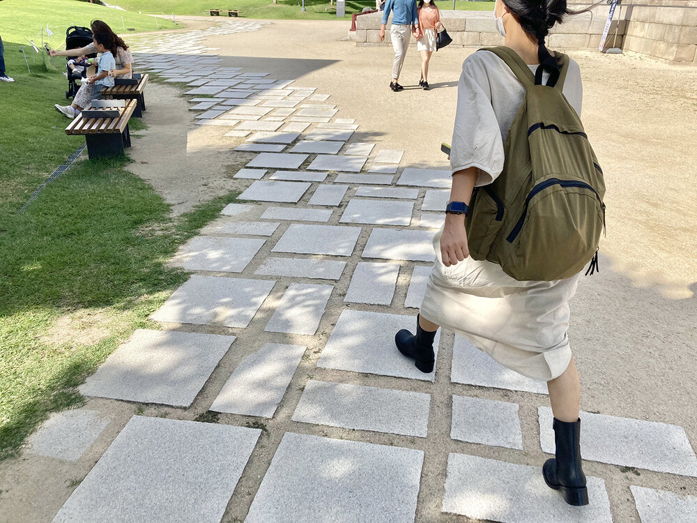 * 첫 날 반 치수 크게 신은 상태. 발은 편하고, 맨 다리에 신었을 때 발목 앞부분이 가죽과 맞닿으면서 이질감이 느껴졌어요. 가죽의 단단함이 몸과 닿을 때 어색하고 불편했어요. 그런데 처음 신었음에도 4시간을 걸었어요. 여유있는 사이즈라 길들이지 않은 불편함 말고는 편했나봐요. (저희는 테스트 때문에 많이 걸었지만, 처음부터 무리해서 오래 신지 마세요!)