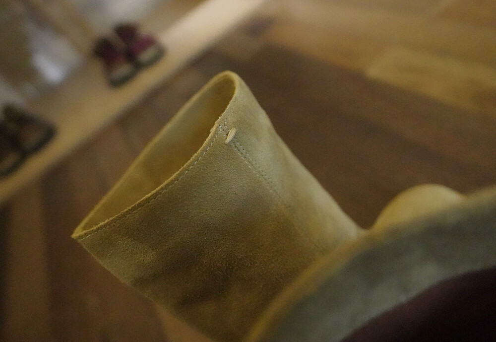 기모 가공한 스프리트 카우 레더는 유연하고 내구성의 좋아 통부츠의 디자인에 적합합니다.