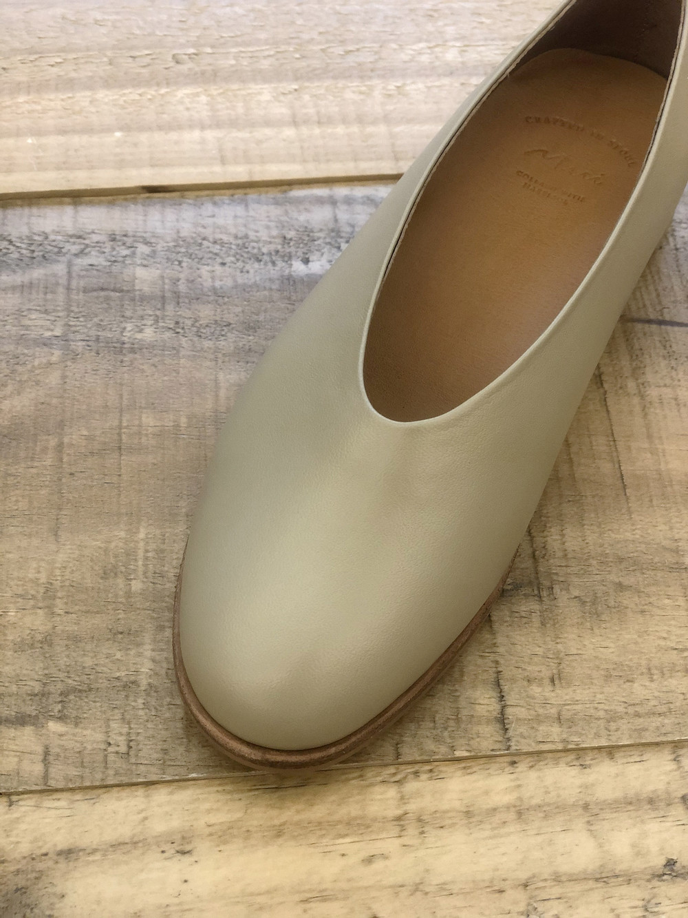 허스플랫은 앞쪽에 보형물을 넣지 않았어요. 보형물은 신발의 형태를 예쁘게 잡아주지만, 발이 편하지 않아요. 결이 고르고 유연한 양가죽에 안감을 대어 작업했어요. 양가죽은 모공이 작고 부드러우며 신축성이 있고 신을수록 자연스러운 주름이 생기는 특징이 있습니다. 허스플랫은 클래식한 무드를 표현하기 위해 양가죽 중에서도 엠보가 거의 없는 가죽을 선택했습니다.