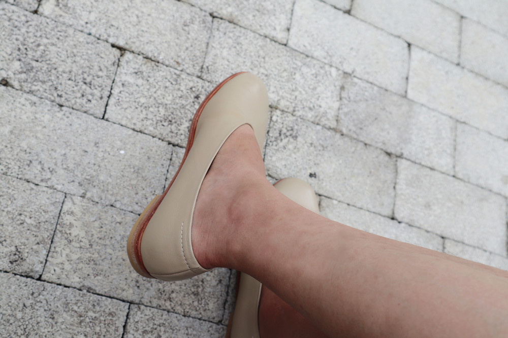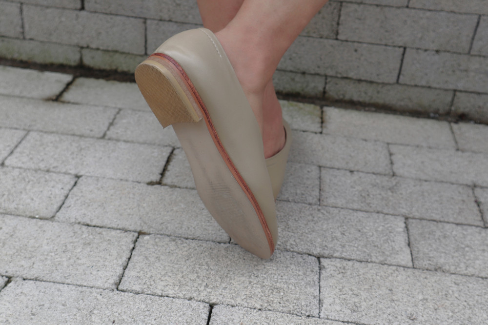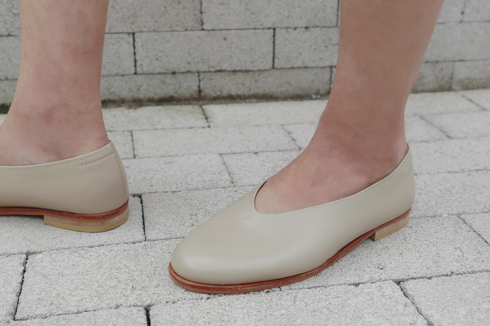 우선 한국인의 발을 생각했어요. 리본이 달린 앞코가 짧은 플랫 슈즈는 서양인의 얇은 발엔 잘 어울리지만 발등이 높고 발볼이 큰 사람에겐 잘 안 어울려요. 그래서 한국인의 발에 예쁘게 어울릴 수 있는 디자인을 구상했습니다. 앞 코가 너무 뾰족하거나 둥글지 않게 발 모양을 옆으로 덮어주며 자연스럽게 흐르는 곡선으로 틀을 잡았어요. 앞 코가 길어 발 생김새를 보완해주면서도 세련되어 보이고, 덧 양말을 신었을 때 보이지 않아 마음의 부담이 없어요.