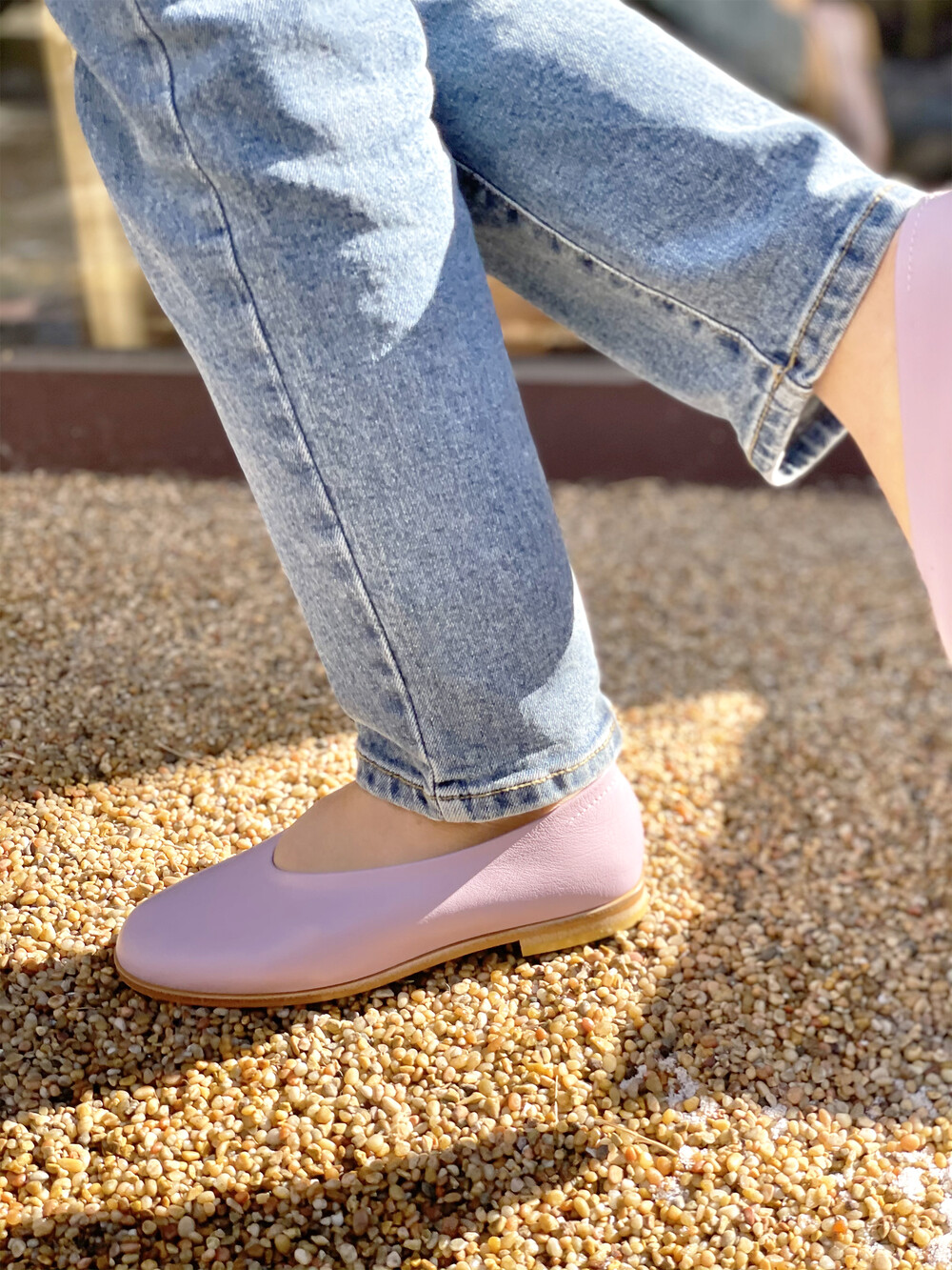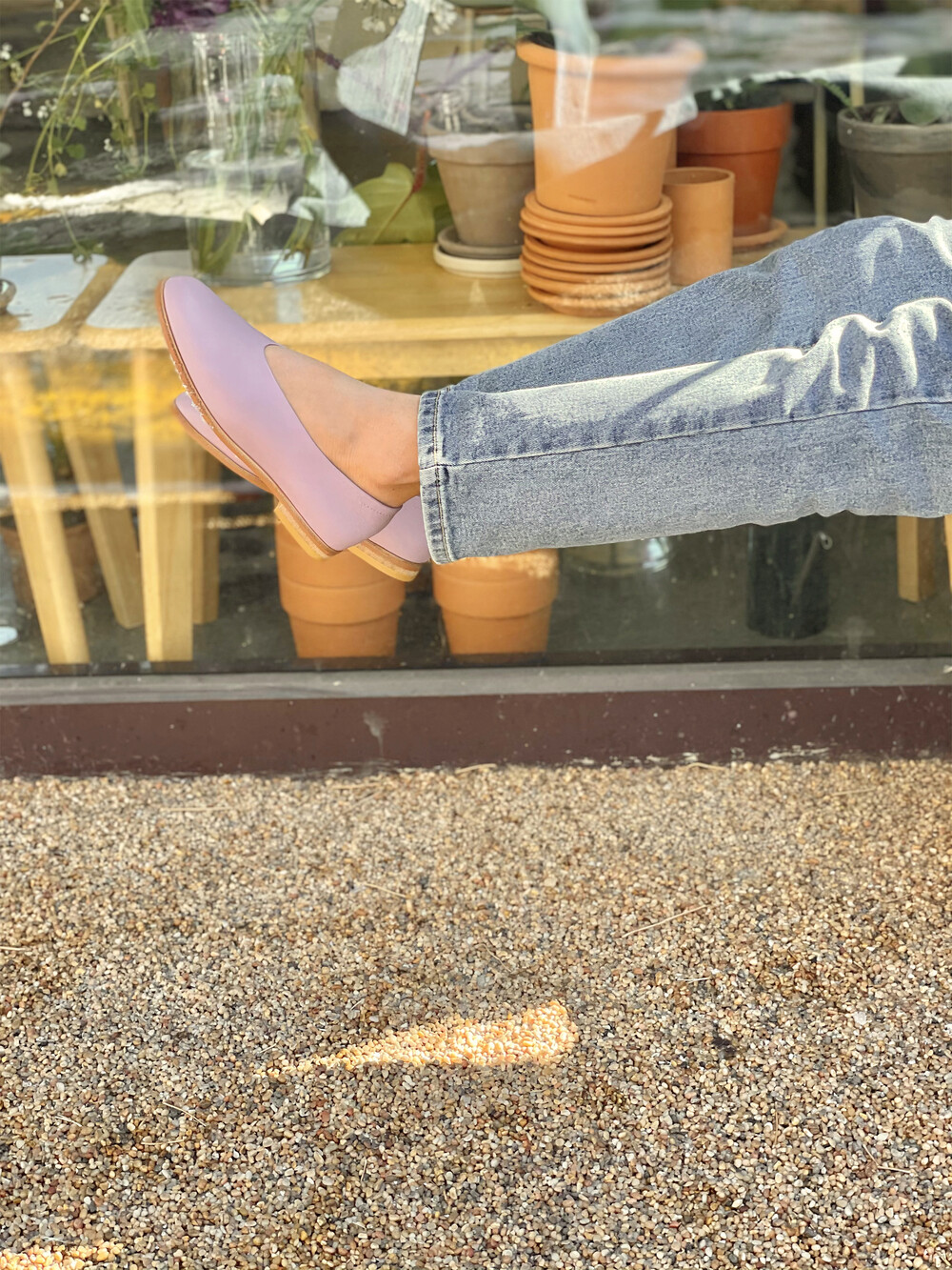 우선 한국인의 발을 생각했어요. 리본이 달린 앞코가 짧은 플랫 슈즈는 서양인의 얇은 발엔 잘 어울리지만 발등이 높고 발볼이 큰 사람에겐 잘 안 어울려요. 그래서 한국인의 발에 예쁘게 어울릴 수 있는 디자인을 구상했습니다. 앞 코가 너무 뾰족하거나 둥글지 않게 발 모양을 옆으로 덮어주며 자연스럽게 흐르는 곡선으로 틀을 잡았어요. 앞 코가 길어 발 생김새를 보완해주면서도 세련되어 보이고, 덧 양말을 신었을 때 보이지 않아 마음의 부담이 없어요.