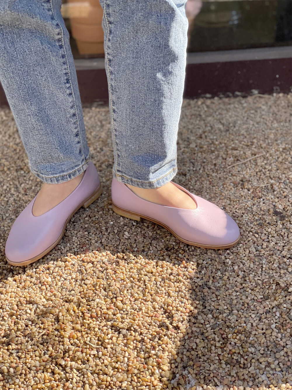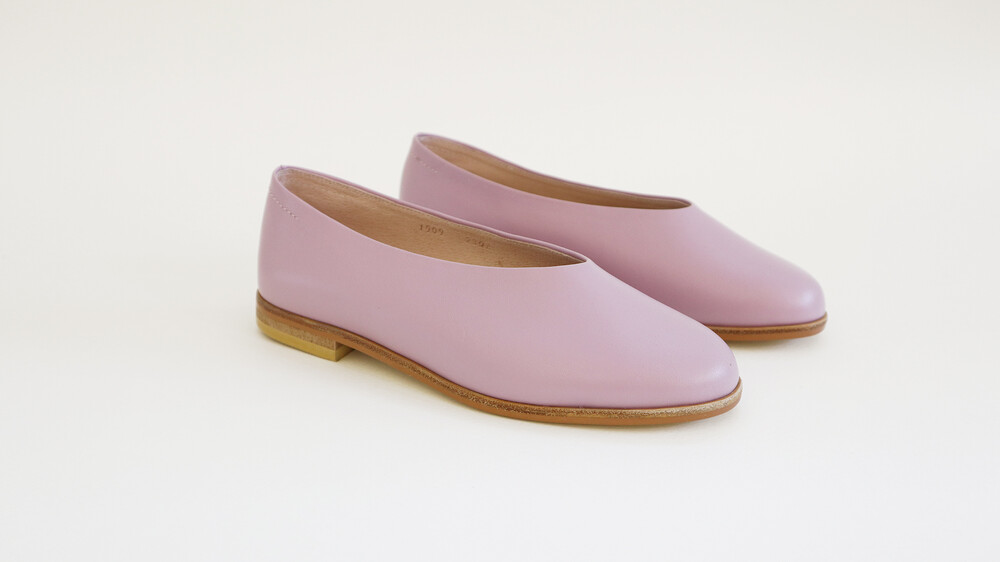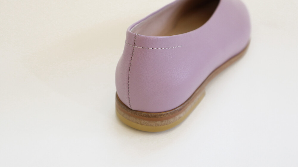 허스플랫은 앞쪽에 보형물을 넣지 않았어요. 보형물은 신발의 형태를 예쁘게 잡아주지만, 발이 편하지 않아요. 결이 고르고 유연한 양가죽에 안감을 대어 작업했어요. 양가죽은 모공이 작고 부드러우며 신축성이 있고 신을수록 자연스러운 주름이 생기는 특징이 있습니다. 허스플랫은 클래식한 무드를 표현하기 위해 양가죽 중에서도 엠보가 거의 없는 가죽을 선택했습니다.