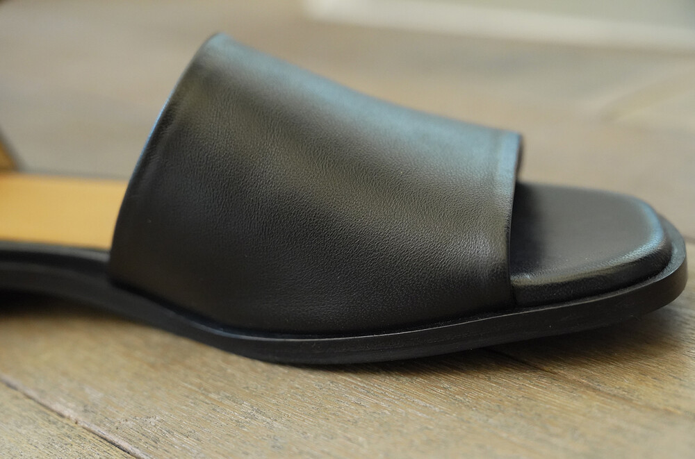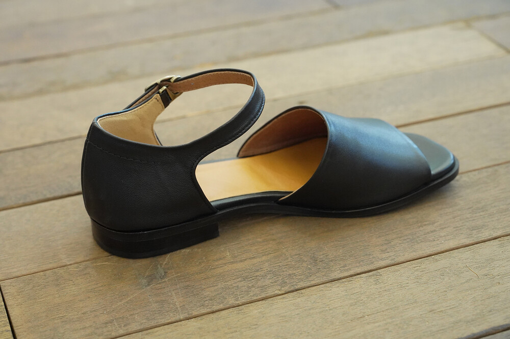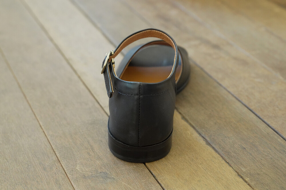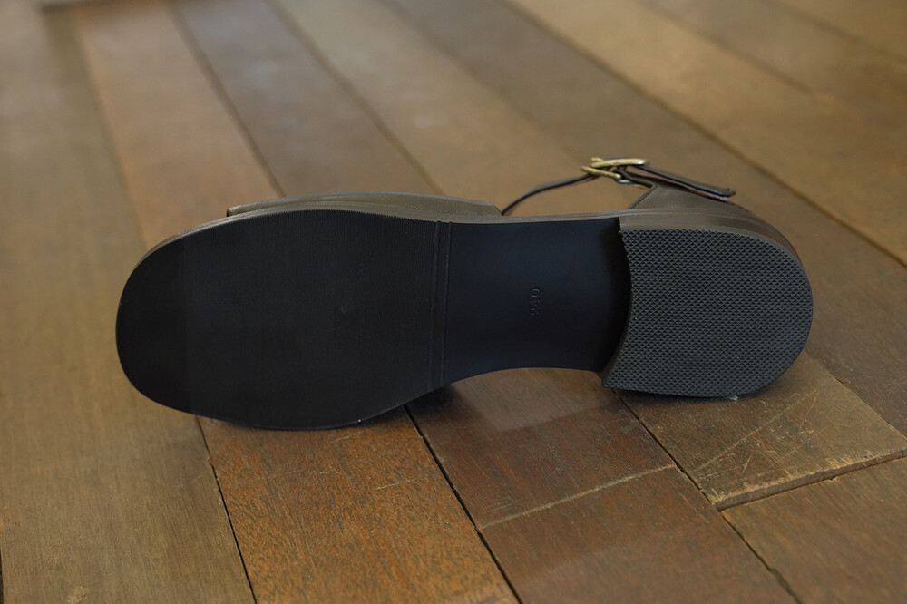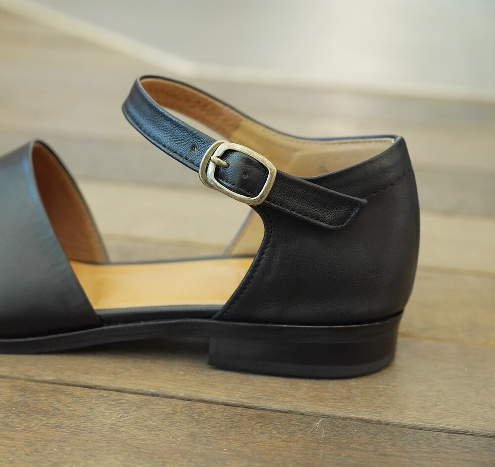 허스샌들의 클래식한 분위기는 스트랩과 뒷꿈치를 가리는 디자인에 있습니다. 스트랩의 이음선을 봉제선 없이 곡선으로 연결하여 담백해졌어요. (고리는 딱 맞게 조정하셔야 걸으실 때 풀어지지 않습니다. )